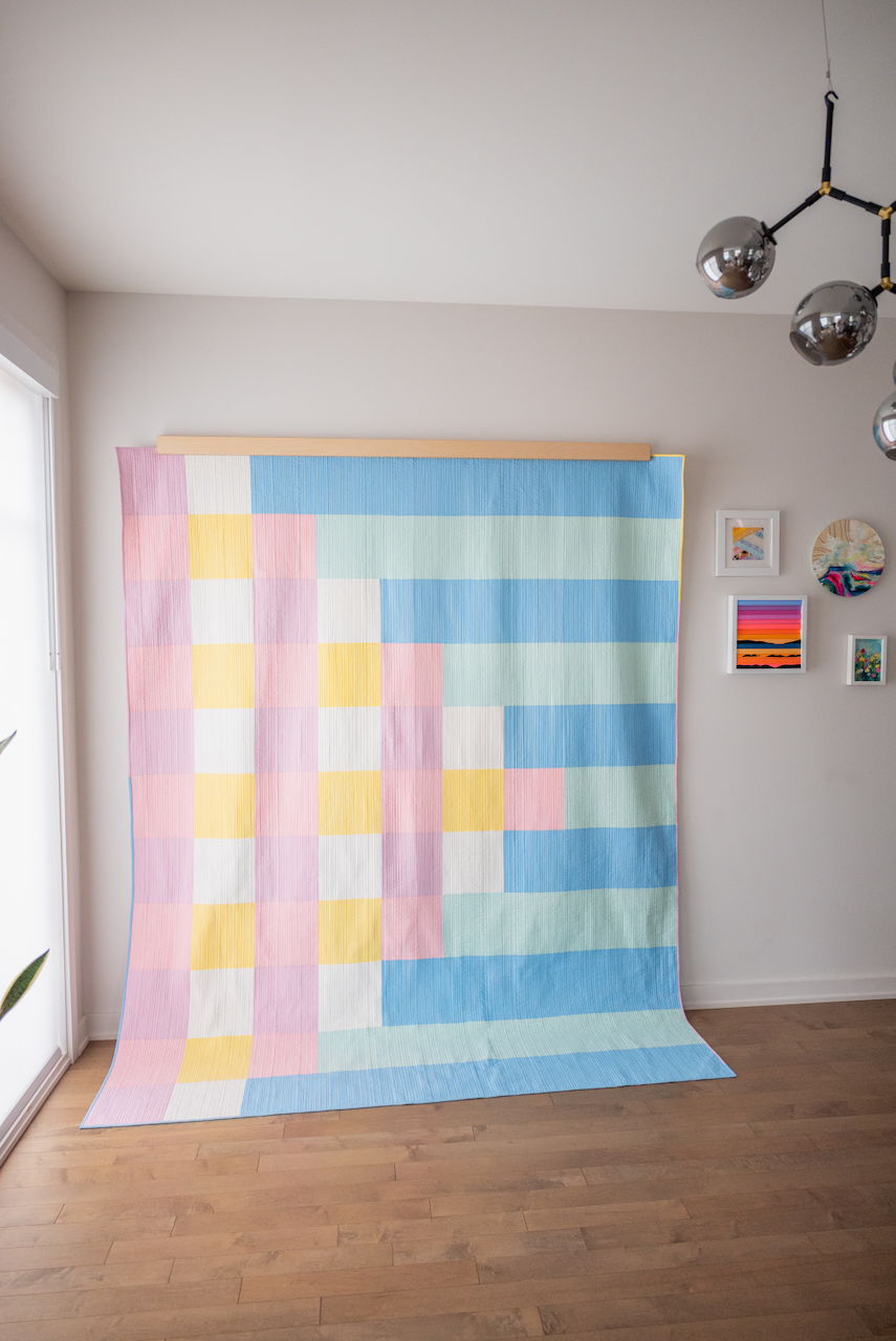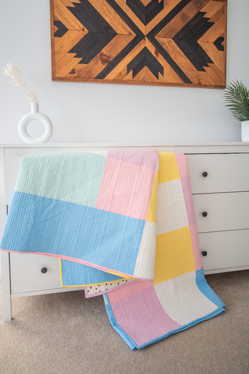 The magazine article is based on a queen size quilt, but I plan to eventually release the pattern as a Twin, Throw, and Baby size. The colours I used to make this cover quilt are Kona Solids Lemon, Dusty Peach, Prairie Sky, Ice Frappe, and Petal. I have already mocked up so many colour ways. Want to see them? Scroll down for some inspiration and if you want the pattern, you can get it in the magazine HERE.