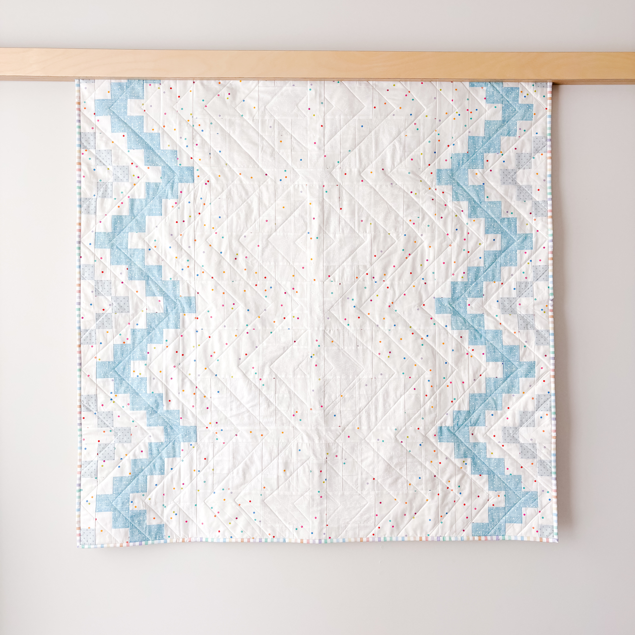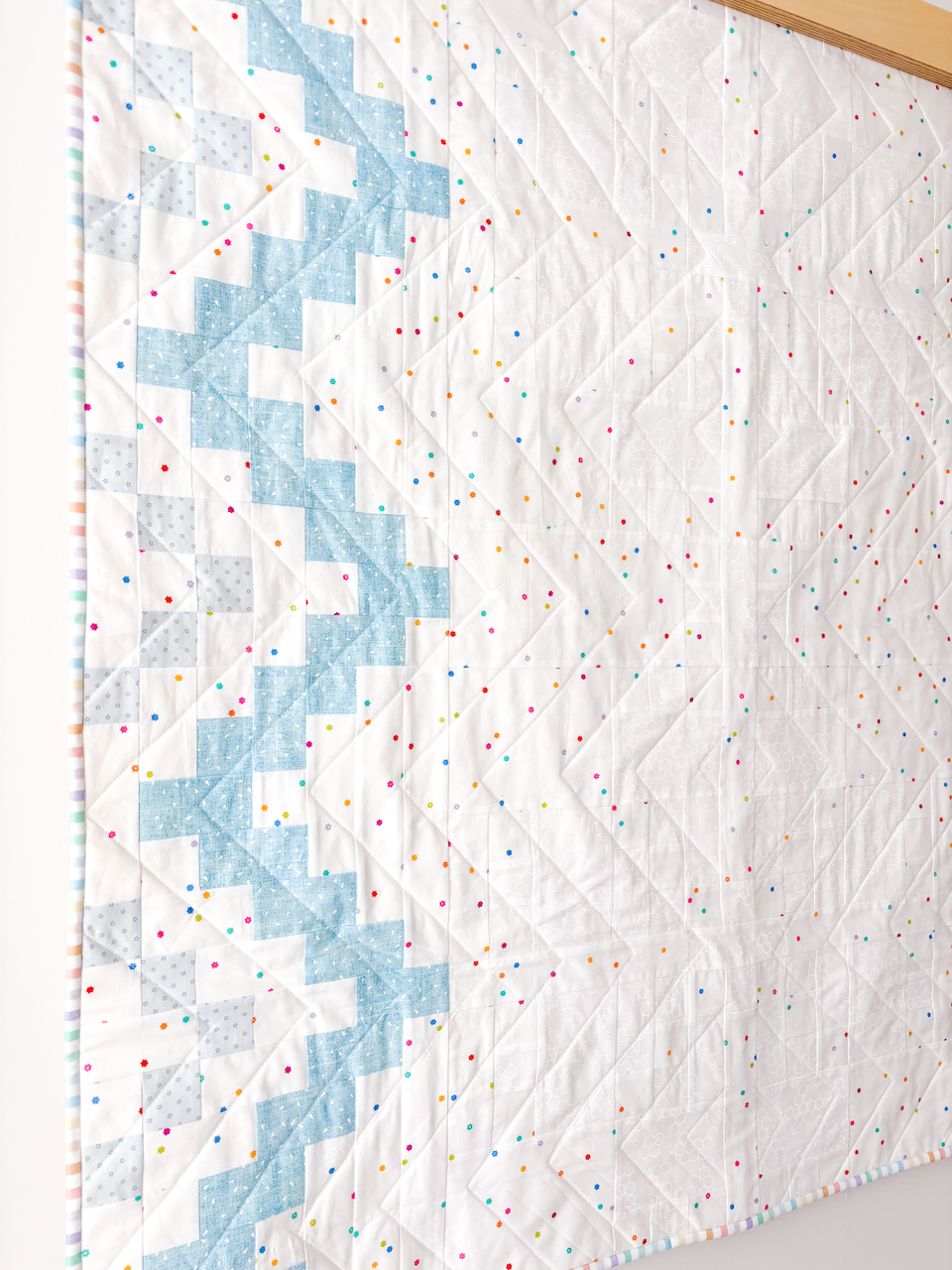 I made a quilt for Figo Fabrics booth at Quilt Con. This is an extra miniature version of my Highland Flora pattern, currently in McCalls Quilting Fall 2025 magazine. Where is the Flora you ask? Well the funny thing about planning quilts with digital fabric swatches, is that sometimes the colours are not what you planned. What I thought was a light grey for the flower turned out to be white, and blended in against the confetti background. Can you see it in the images? The low volume hexie print is my favourite out of the ones I used, but I would have swapped the colourful speckles for the flower and made the hexies for the background. Still a super cute baby quilt that I will be gifting to a friend.